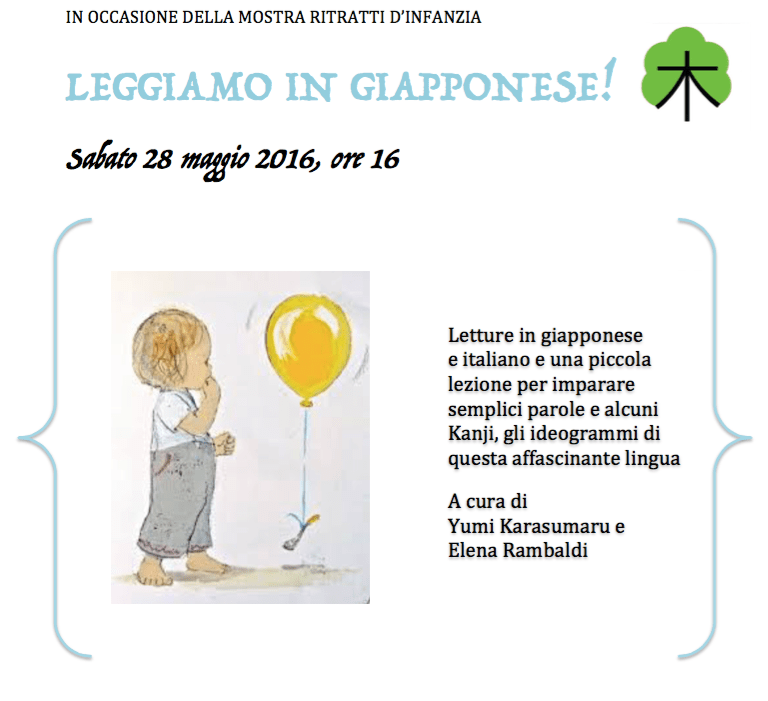 Sabato 28 maggio alle 16, appuntamento sotto le teche della mostra “Ritratti d’Infanzia” per un pomeriggio di lettura in lingua giapponese e italiana. L’artista Yumi Karasumaru ci terrà compagnia leggendo ai bambini alcune storie di Komako Sakai, Akiko Hayashi e Akiko Miyakoshi. Poi, una piccola lezione di questa meravigliosa lingua tutta dedicata ai bambini, alla scoperta dei misteriosi e affascinanti Kanji.