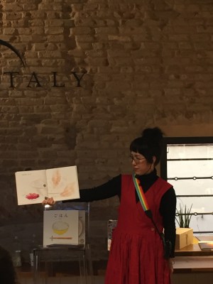 Quest’anno ho avuto il piacere di conoscere anche Aya Ishii e Nao Nakashima e il bellissimo progetto di Nijinoehonya. Me le hanno presentate Ayumi e Fumitaka Kudo, altri due artisti giapponesi che vivono in Italia e il cui lavoro vi consiglio di scoprire. Aya e Nao hanno una libreria specializzata, una casa editrice, una piccola galleria e organizzano performance ed eventi intorno ai libri illustrati.