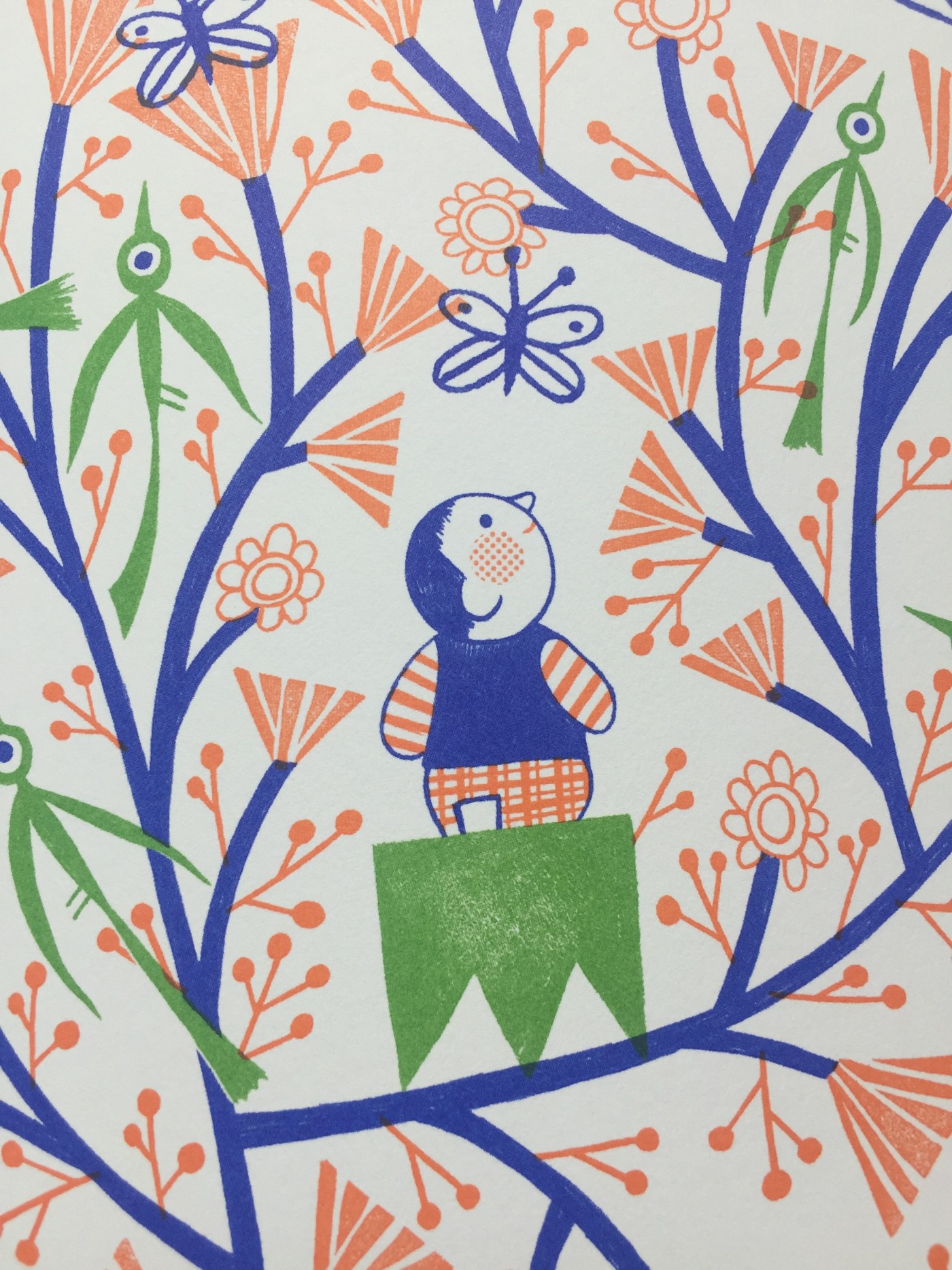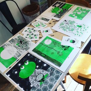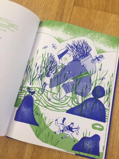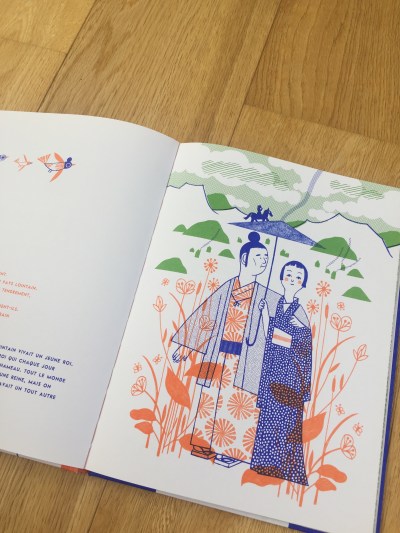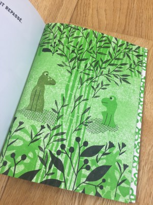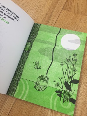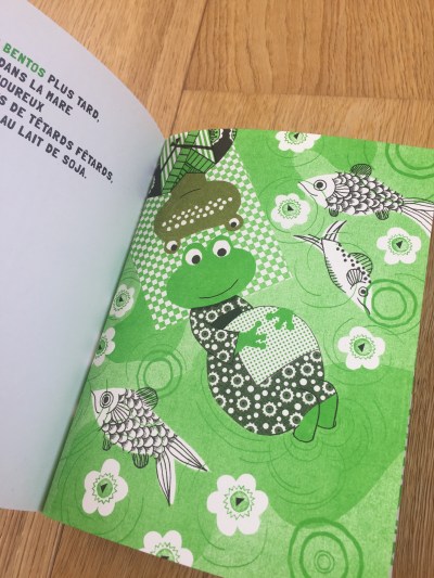 Il verde e il nero e infinite texture omaggio ai tessuti giapponesi, sono i colori delle pagine del piccolo albo a punto metallico con copertina cartonata. La rana Matcha alla fine della storia è centenaria, ha avuto tredici mariti, molti girini e pratica l’Ikebana