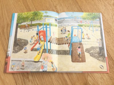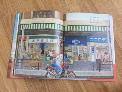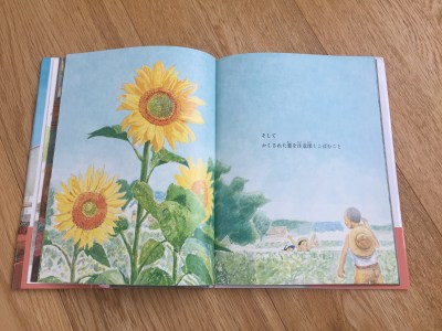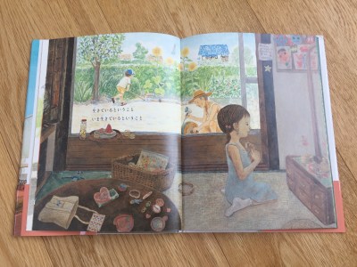 Nella copertina è raffigurato un condominio. I panni sono stesi, il cielo è terso e si percepisce il caldo estivo. Dalla terrazza una mamma allunga un cappellino bianco e blu al suo bambino, che con la sorella, sta per uscire per una passeggiata nel quartiere. Librerie specializzate giapponesi, appassionati di libri illustrati, tutti stanno condividendo la foto di questo albo sui social. Perché? Perché racconta magistralmente un giorno d’estate giapponese? Un giorno comune in cui succedono tante piccole cose, un giorno qualsiasi in cui il bambino lettore può riconoscere nelle pagine del libro, la vita quotidiana che scorre quietamente? Dove puoi vedere un quartiere di periferia, la campagna con i campi e i girasoli, il gioco solitario di una bambina nella sua cameretta, la vita e la morte di una cicala? Si, ma c’è qualcosa di più. Le figure di questo albo illustrato accompagnano una delle poesie più famose di Shuntarō Tanikawa (谷川 俊太郎 ) grandissimo poeta, scrittore e traduttore, autore di inni scolastici, testi di canzoni, sceneggiature di radiodrammi, film e fiction tv e di numerose opere di poesia per bambini.