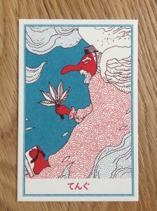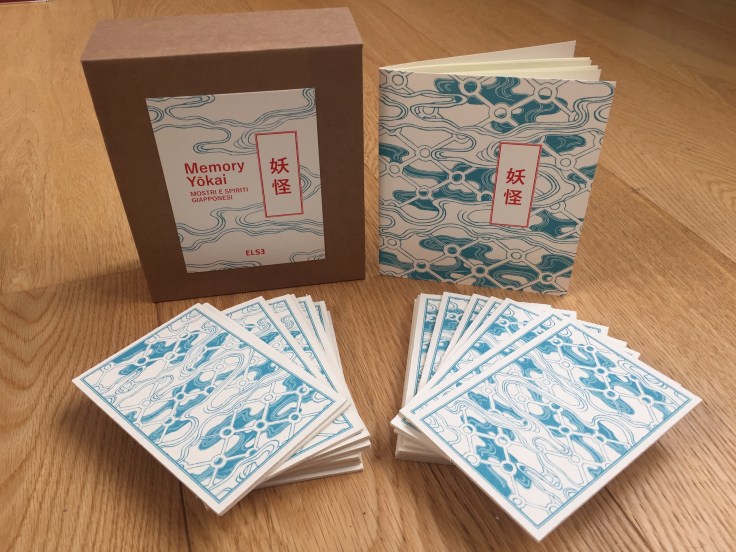 Si tratta di Memory Yōkai. Mostri e spiriti giapponesi di Else edizioni. Uno specialissimo memory realizzato appositamente per l’evento, in stampa serigrafica e tiratura limitata di 350 copie. La prima cosa che noto, aprendo la scatolina, è l’armonia della confezione, in perfetto stile nipponico. All’interno un piccolo libricino, che in copertina ha lo stesso retro delle carte, presenta gli illustratori che hanno realizzato le tessere e gli Yōkai che sono stati a loro affidati.