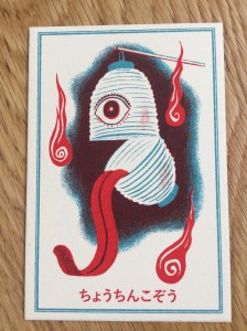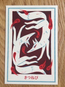 Ha realizzato la carta di Kitsunebi, i fuochi delle volpe (altro elemento memorabile in alcuni cartoni animati giapponesi). La volpe nella cultura giapponese è un animale magico, ama spesso ingannare l’uomo trasformandosi in una bella donna. Chōchin- Kozō, il monello lanterna, invece rappresenta un’altra caratteristica degli Yōkai, che possono essere anche oggetti che dopo cent’anni di uso diventano vivi. Questa credenza è nata fin dal Medioevo e in Giappone ci sono delle vere e proprie cerimonie per ringraziare i vecchi oggetti per il loro lavoro.