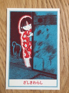 Lavora in litografia e pastelli e per il memory ha illustrato le tessere di Daidarabocchi, il gigante che ha creato il monte Fuji e di Zashiki-Warashi (uno dei miei Yōkai preferiti) che puoi incontrare nelle case più vecchie del Giappone del nord. Un bambino o bambina fra i due e i dieci anni, visibile solo agli abitanti della casa e a volte solo i bambini. Adora fare scherzi, ma è legato ad un triste passato nel quale i neonati morivano per mancanza di cibo e venivano sepolti in casa, diventandone poi gli spiriti protettori.