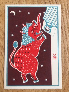 Per le sue illustrazioni usa principalmente l’incisione su linoleum. Per il Memory di Else ha realizzato Baku, un’animale fantastico di origine cinese e Oni, antichissimo mostro giapponese molto caro ai bambini degli anni ’80 di cui sopra.