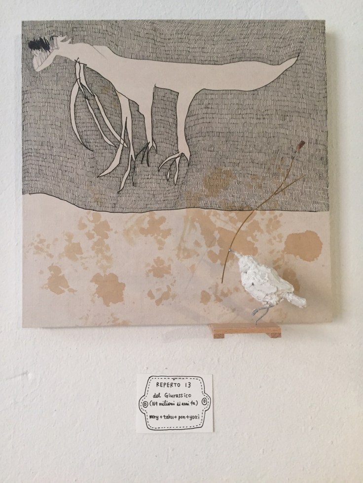 Piccole teche senza vetro contengono reperti che ci riportano indietro di milioni di anni, nel Pliocene o nel periodo Cambriano. Ci sono i dinosauri, ma anche le auto. I disegni dell’abile mano del piccolo Taku si accompagnano al segno inconfondibile di Yocci e alle tracce di Pon. Completa il lavoro l’intervento di Mory, con meravigliose sculture che si appoggiano delicatamente sull’opera o ne sono incastonate.
